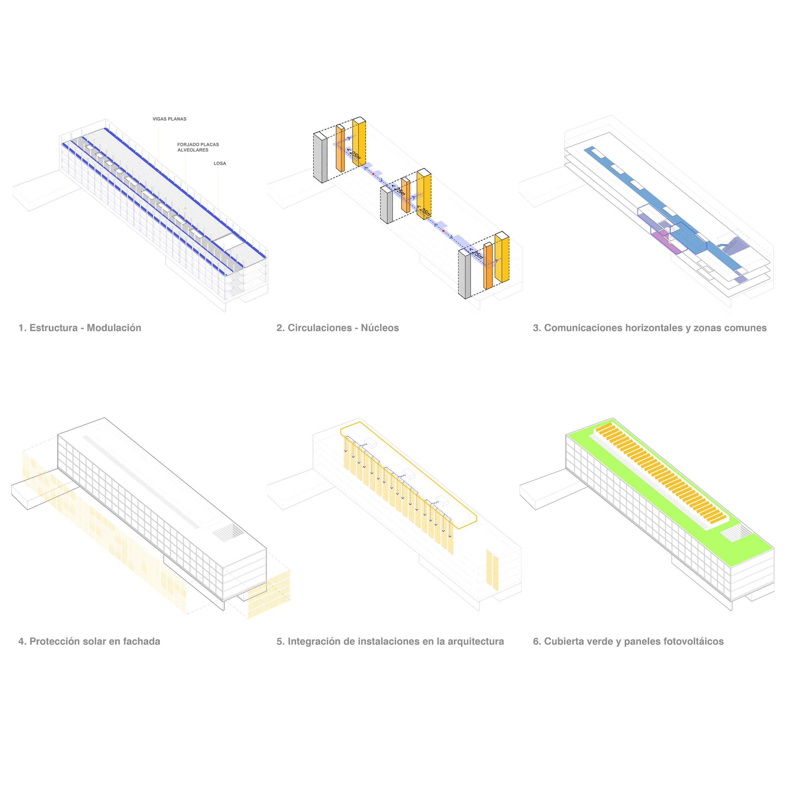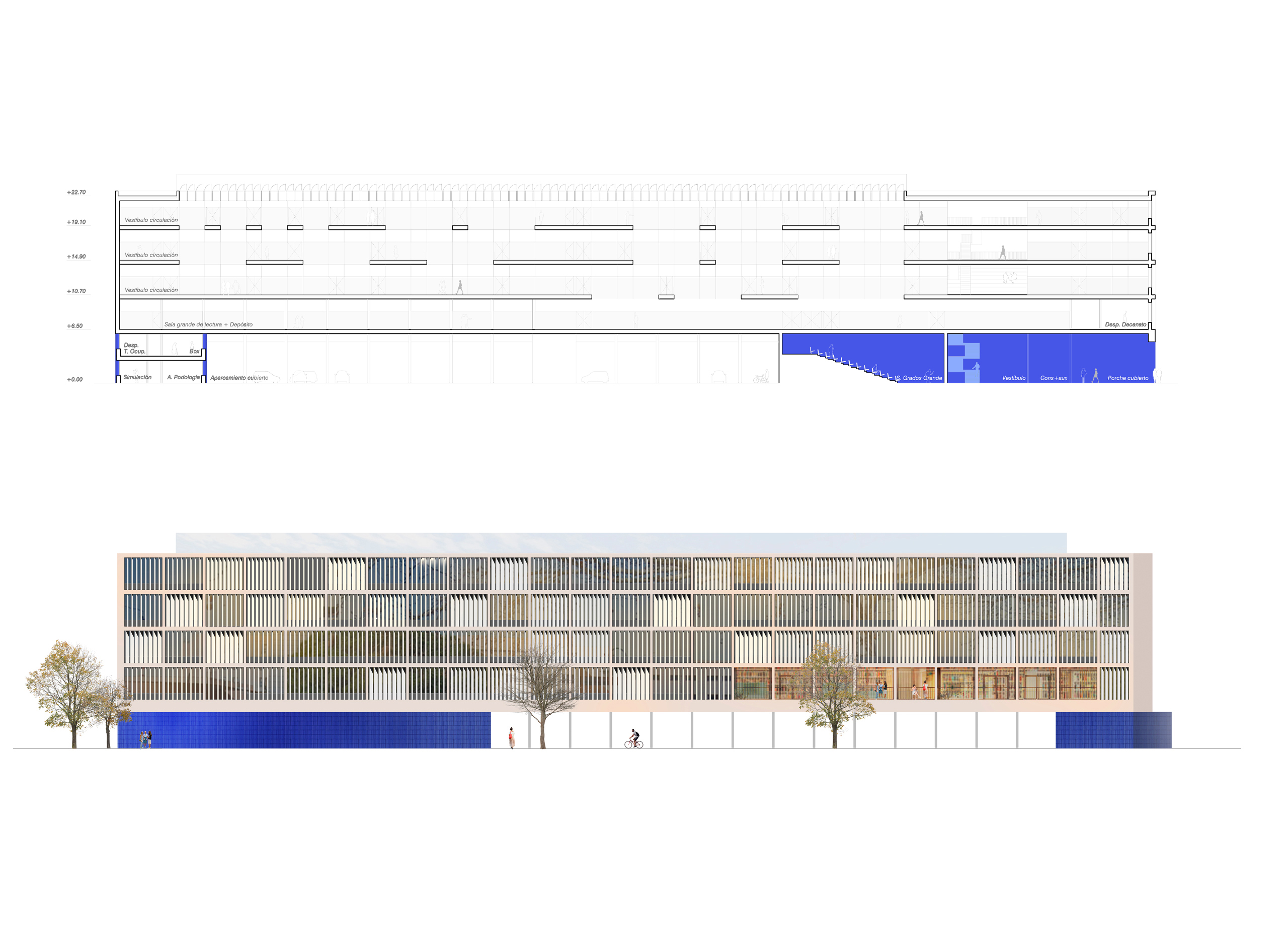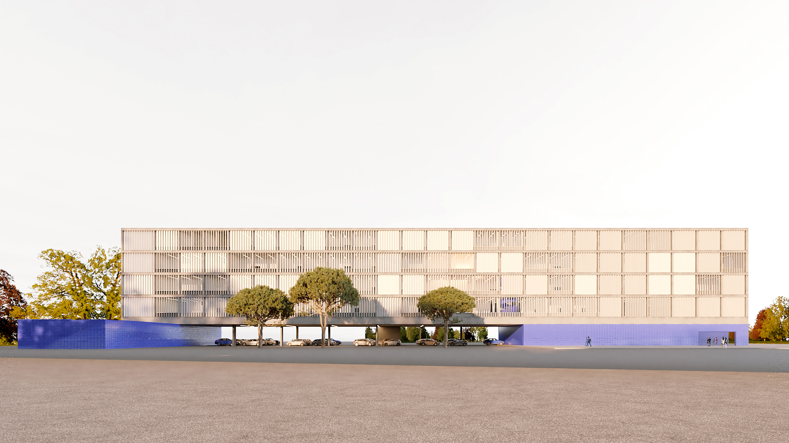 Ocupamos por completo la huella de 125 x 25 m para desarrollar un volumen bajo, más cercano y relacionado con su entorno inmediato, liberando en planta baja una plaza cubierta que puede funcionar como aparcamiento o como espacio de eventos. La estructura se resuelve con pórticos industrializados que hacen del orden constructivo una razón material y permiten alcanzar altos estándares de sostenibilidad y circularidad. Sobre este sistema se disponen dos plementos: un cerramiento interior de vidrio que garantiza estanqueidad y aislamiento, y una piel exterior de lamas motorizadas que regula el soleamiento estacional y actúa como sencilla máquina termodinámica, construyendo una presencia cambiante del edificio en el contexto.