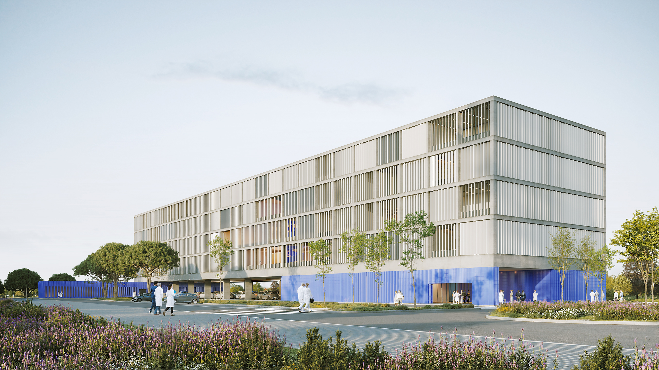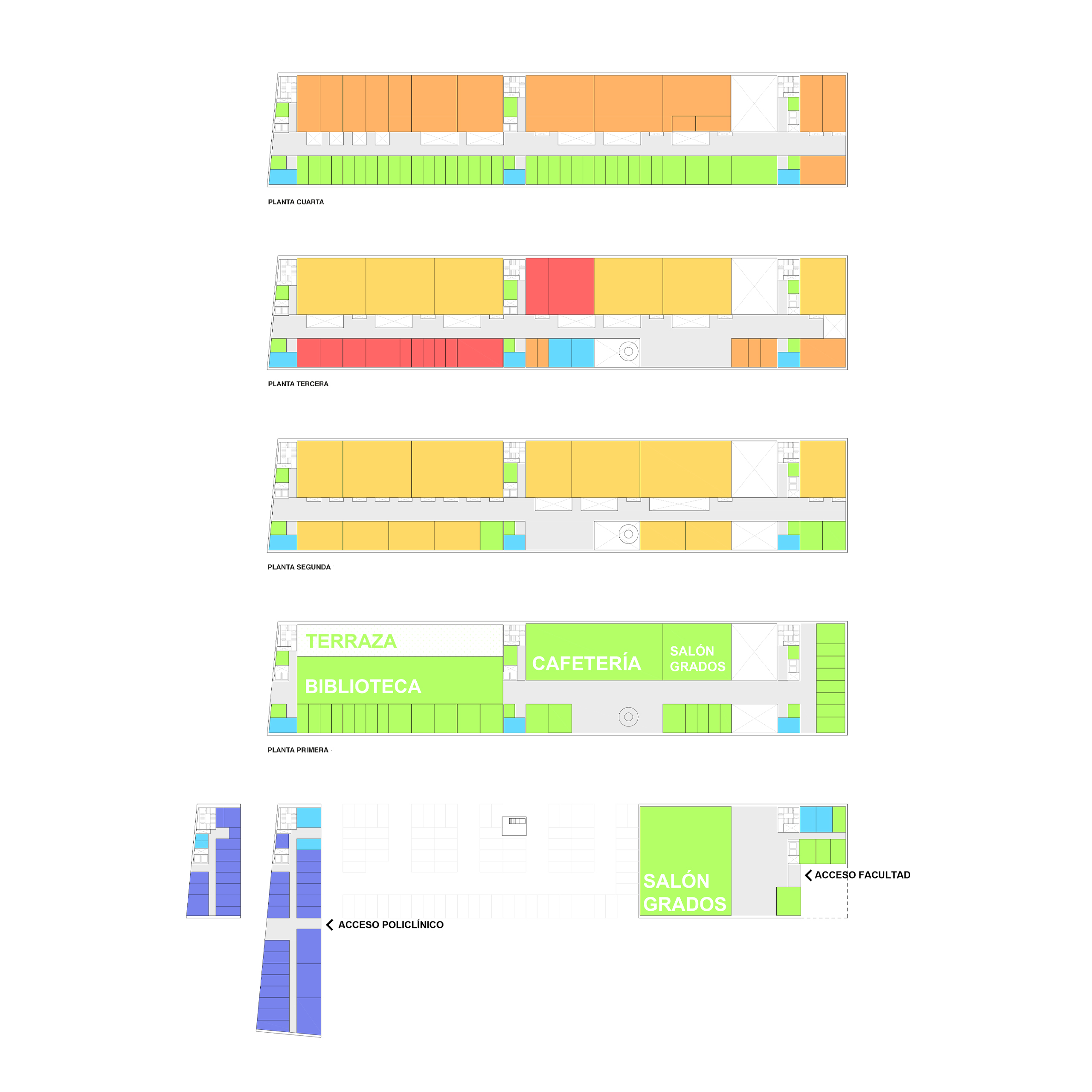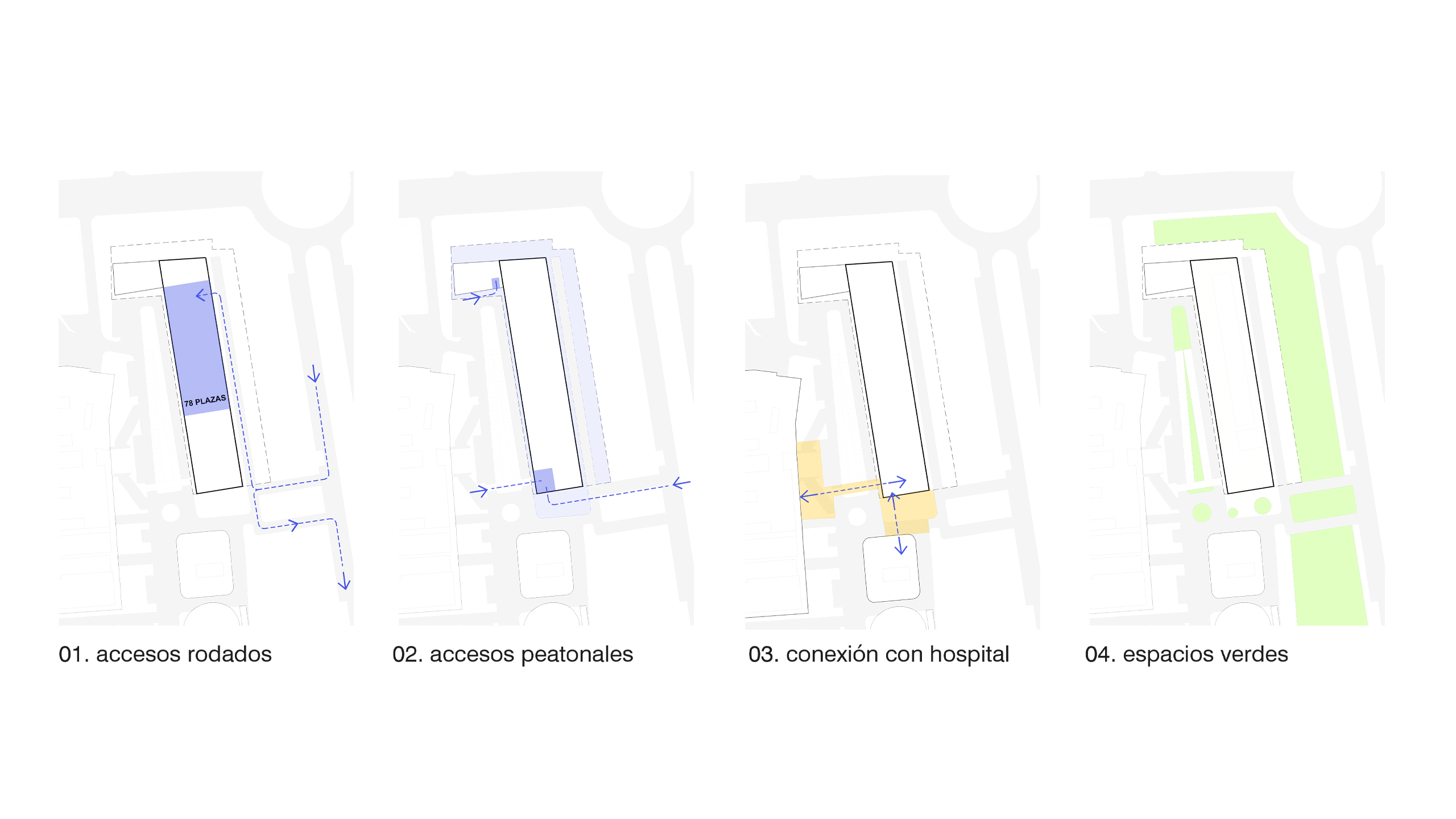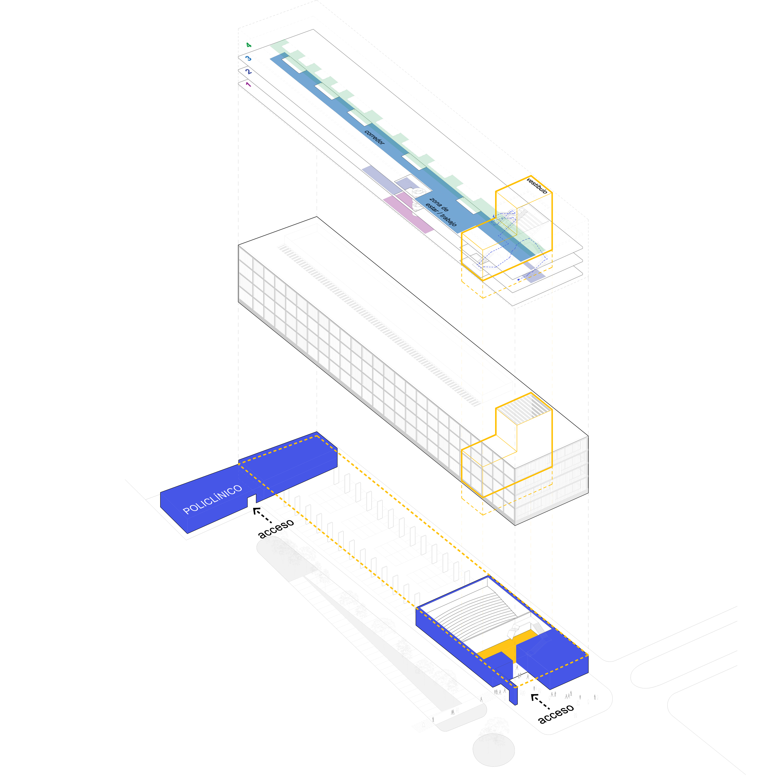 El volumen se apoya en el terreno mediante dos piezas: al sur, el acceso principal, que se abre hacia una pequeña plaza; y al norte, el Policlínico, con entrada independiente y próximo al acceso a consultas del Hospital. Ambas piezas, se significan en su materialidad: una cerámica brillante de tono añil y actúa como signo urbano en un entorno heterogéneo.
