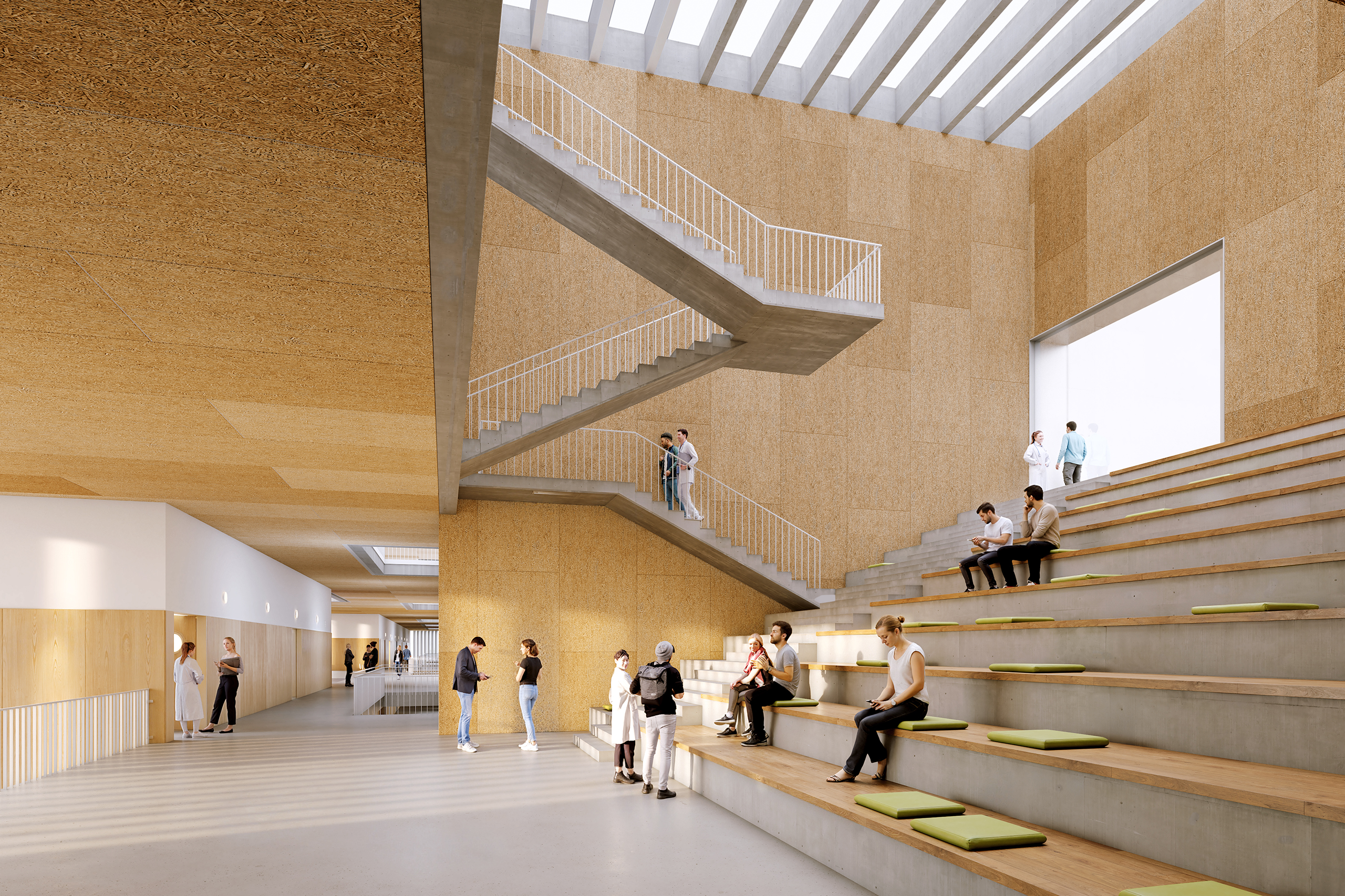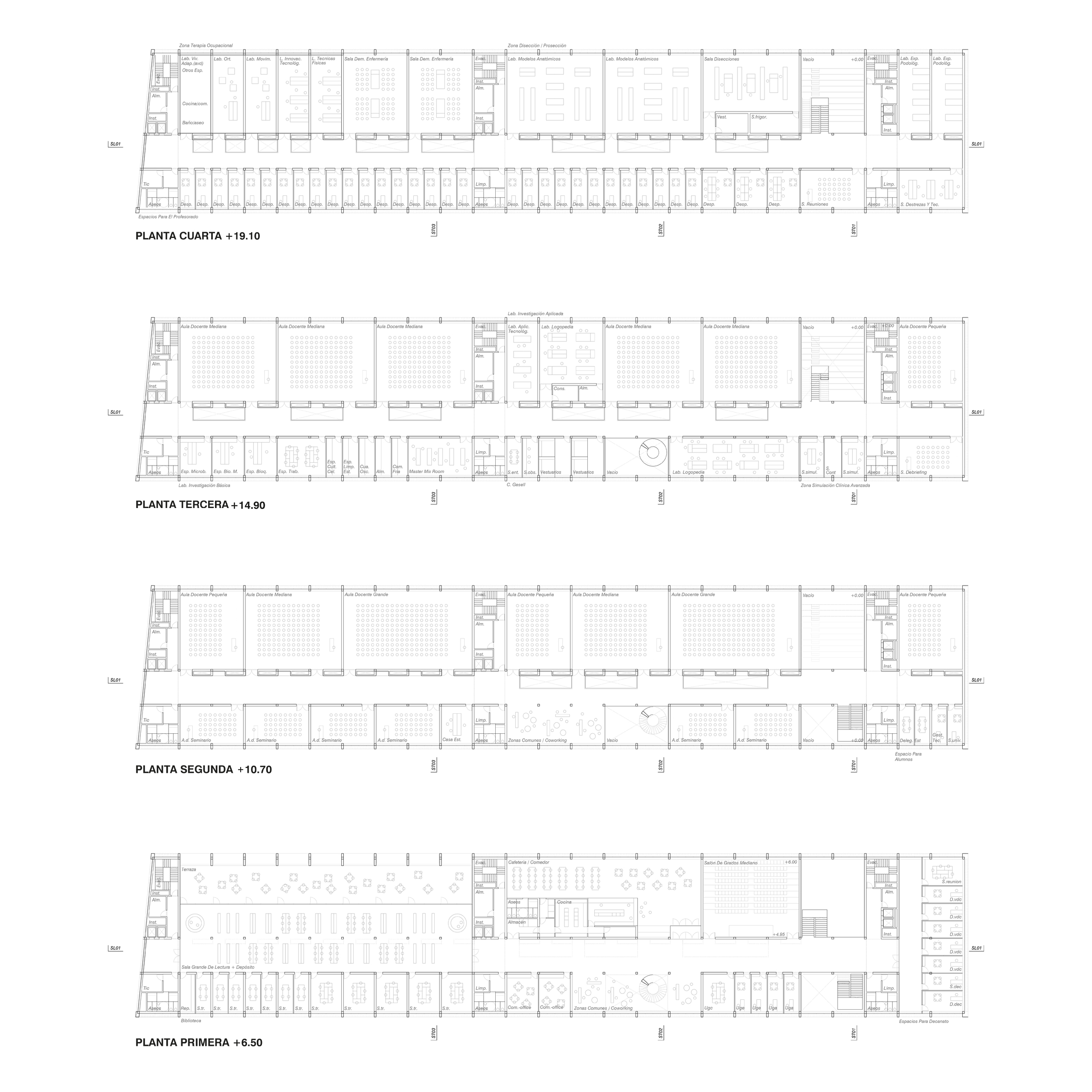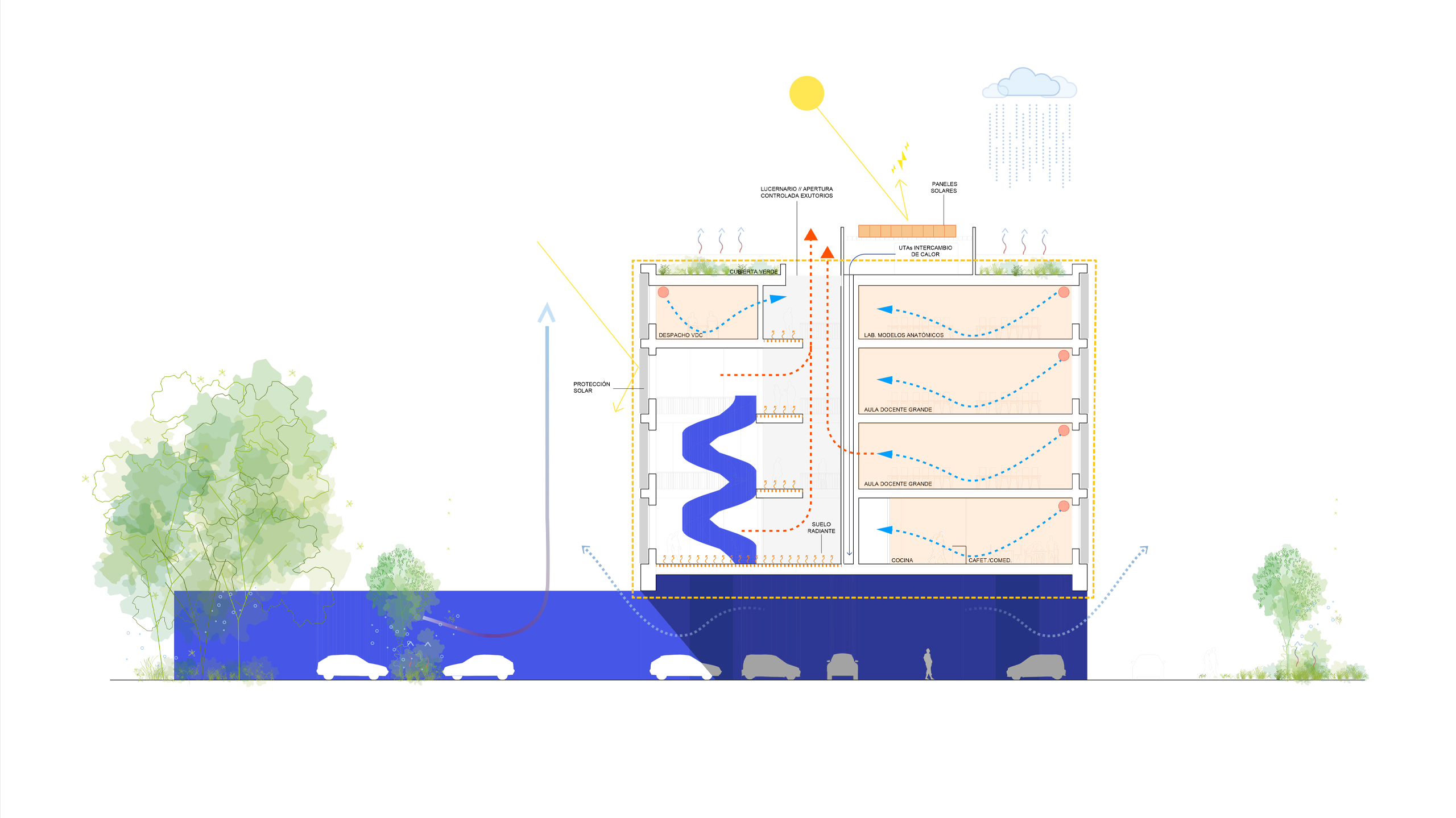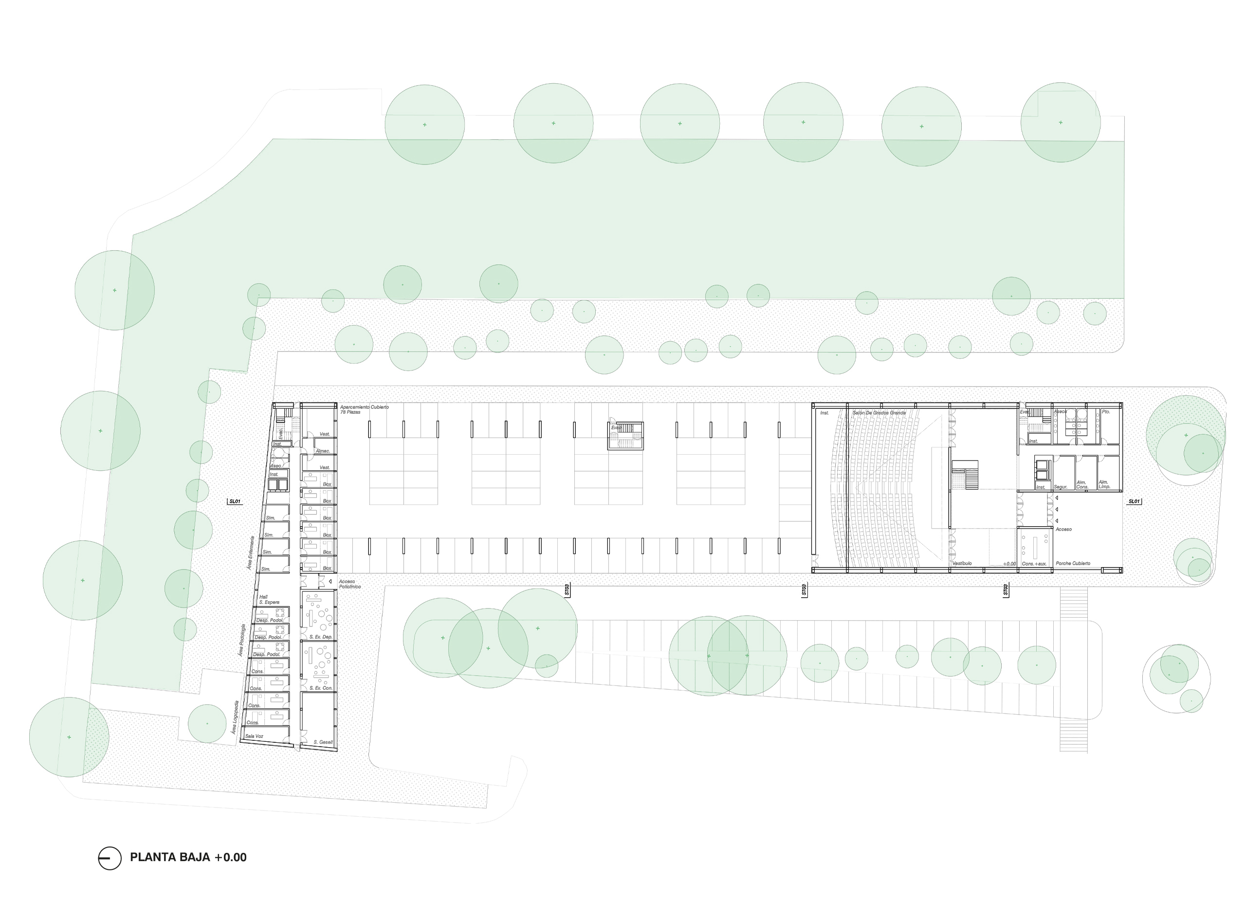 El orden del proyecto nace de una pauta estructural de crujías de 5 metros, que permite organizar el programa dentro de un volumen compacto pero poroso. Compacto, para expresar claridad institucional, autonomía y orden en el entorno; poroso, para introducir vacíos, patios y espacios de encuentro que domestican las grandes dimensiones de circulaciones y programas. El gran vestíbulo vertical, con su escalera libre, se convierte en el corazón del edificio, en busca de luz y nuevas perspectivas y programas.